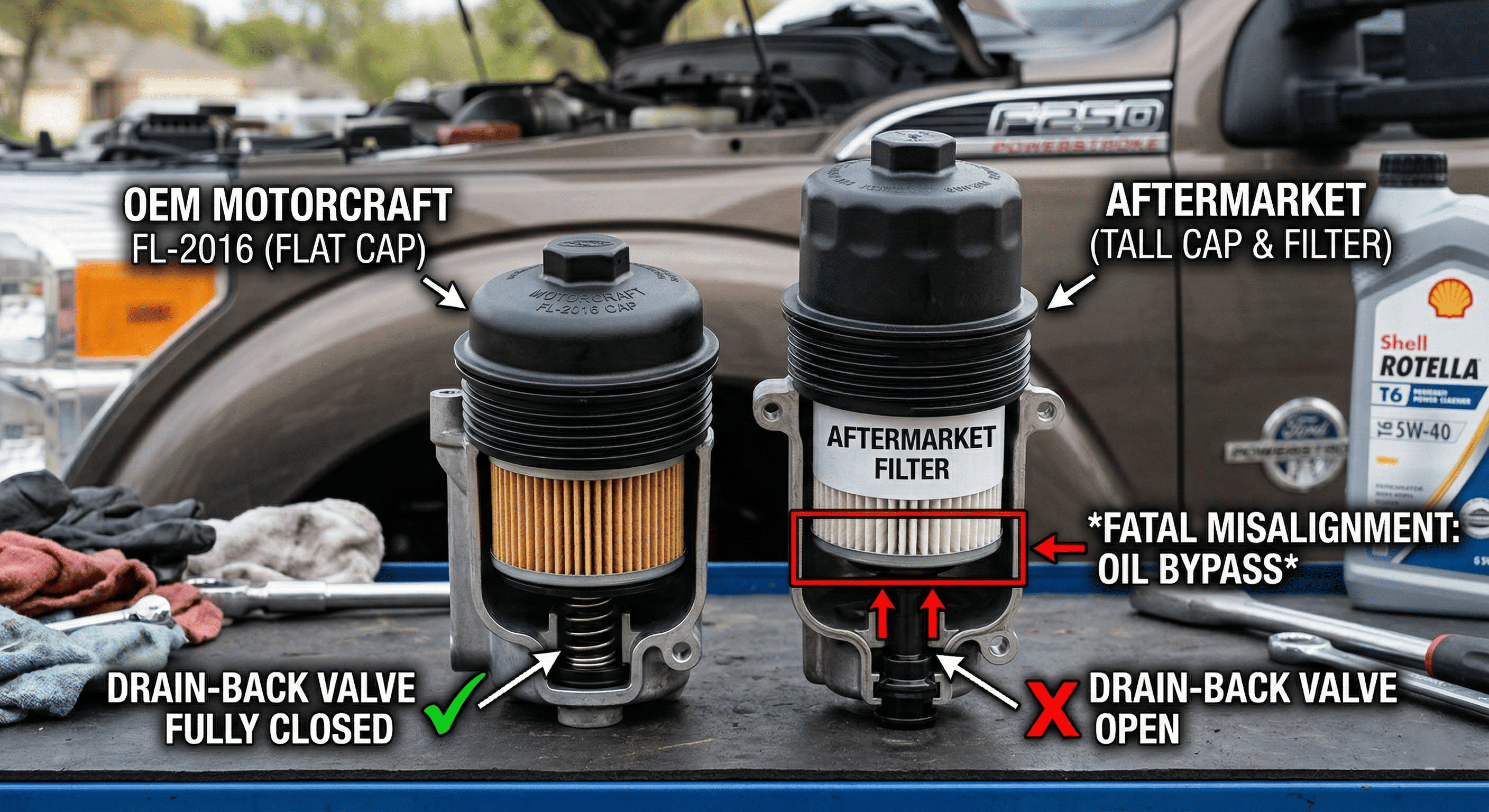 The Motorcraft FL-2016 Mandate There is only one acceptable oil filter for the 6.0L Powerstroke: the Motorcraft FL-2016. This is not brand loyalty or marketing. It is an engineering specification. The FL-2016 is designed to the exact cartridge height and bypass valve calibration that Ford engineered into the 6.0L filter housing. The filter's physical dimensions ensure that when the housing cap is torqued down, the internal drain-back valve seats fully and correctly — sealing the housing and allowing the entire 15-quart volume to pressurize properly on startup.