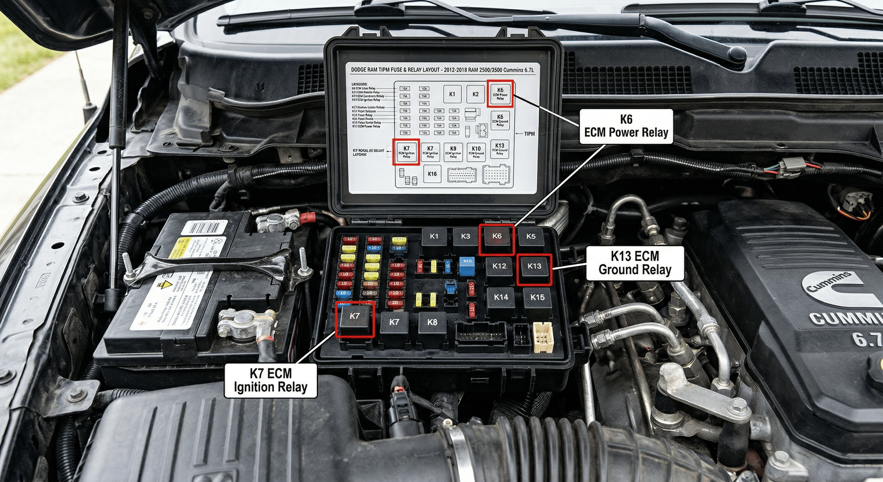 Step 3: Check ECM Power Relays and Fuses Action : Locate the fuse and relay panel (typically in the engine bay on Cummins-equipped Ram and commercial trucks) and identify the relays and fuses associated with ECM power supply. Consult your service manual for the exact fuse numbers — on most ISB/ISC/ISL applications, there are one or two dedicated ECM power fuses and at least one ECM power relay.