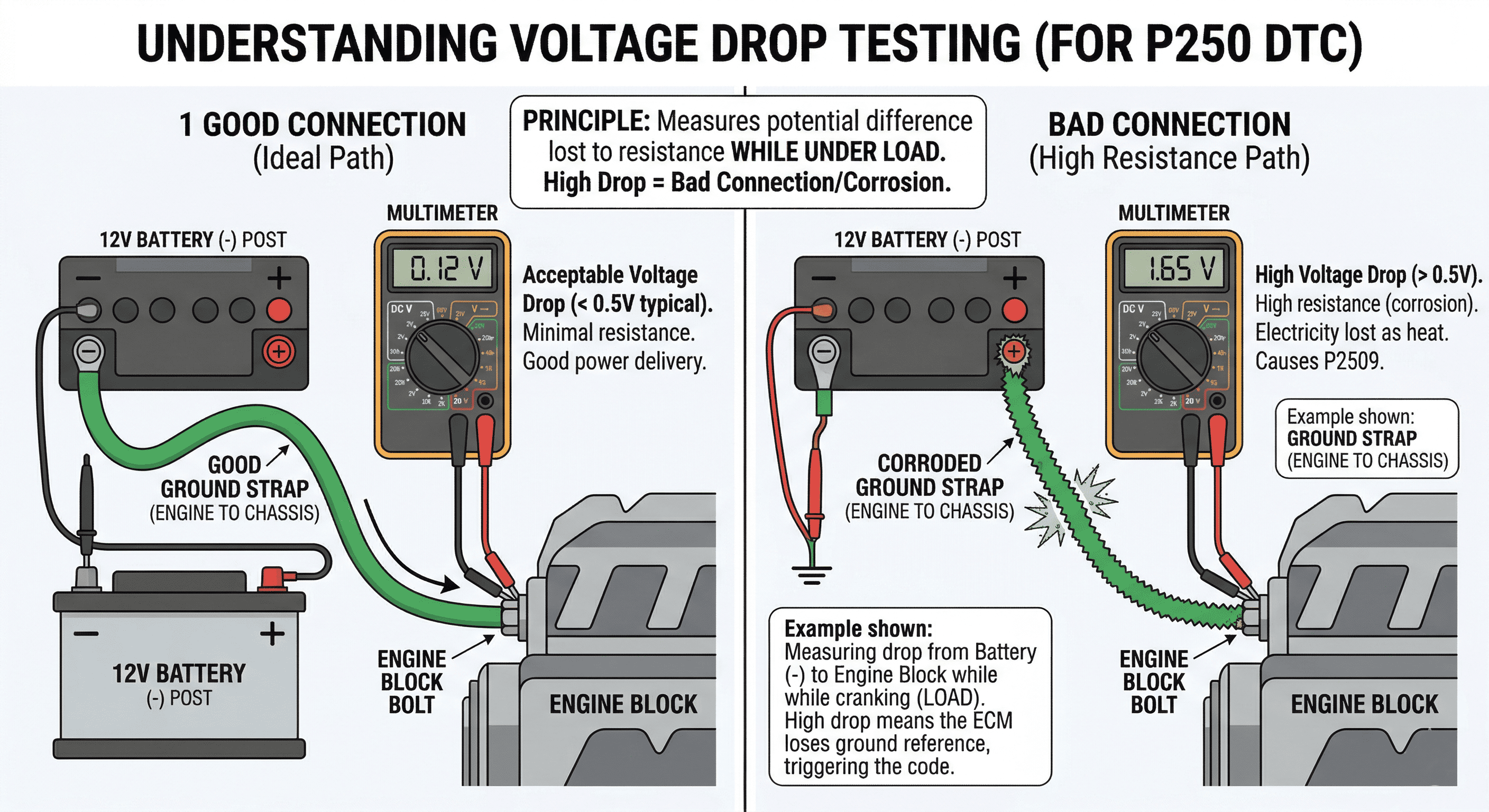 Fix : A high voltage drop on the power side points to a damaged wire, corroded connector, or a failing fusible link. On the ground side, the most common culprit is a chassis ground strap — the braided or solid copper strap that connects the engine block or battery negative to the firewall or frame. These ground straps corrode internally while appearing intact externally. Unbolt, clean the contact surfaces to bare metal, and reinstall with fresh hardware. Adding a supplemental ground strap from the battery negative to the chassis is cheap and often permanently resolves intermittent electrical gremlins on high-mileage trucks.