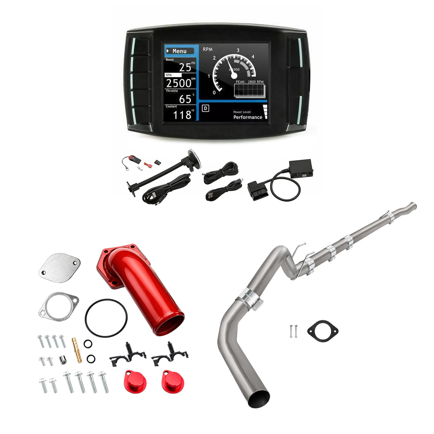 | Package Includes | Mini Maxx Tuner V1, 4" Downpipe-Back Exhaust, EGR Delete Kit (Red Version) |